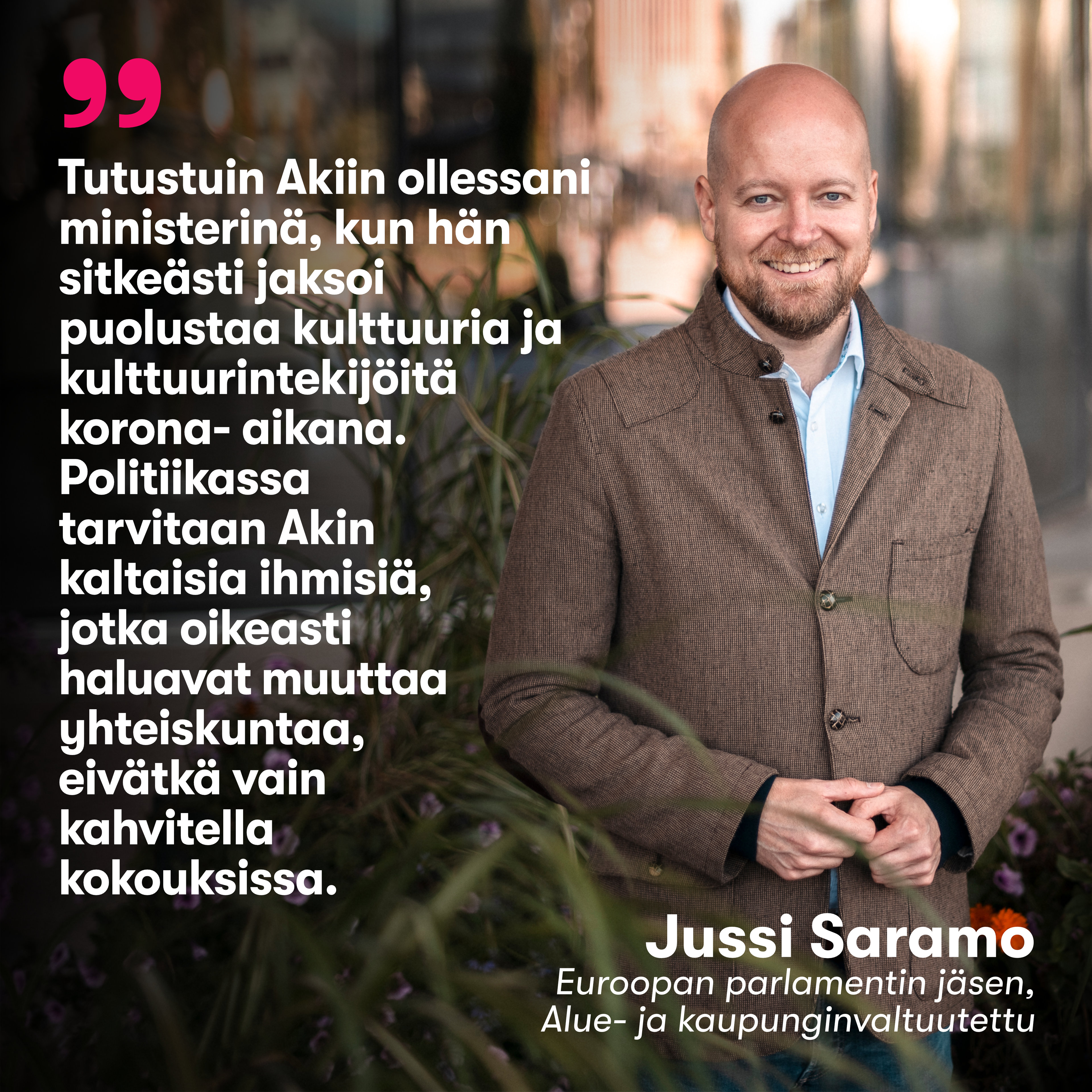 "Tutustuin Akiin ollessani ministerinä, kun hän sitkeästi jaksoi puolustaa kulttuuria ja kulttuurintekijöitä korona-aikana. Politiikassa tarvitaan Akin kaltaisia ihmisiä, jotka oikeasti haluavat muuttaa yhteiskuntaa, eivätkä vain kahvitella kokouksissa." - Jussi Saramo (Euroopan parlamentin jäsen, alue- ja kaupunginvaltuutettu)